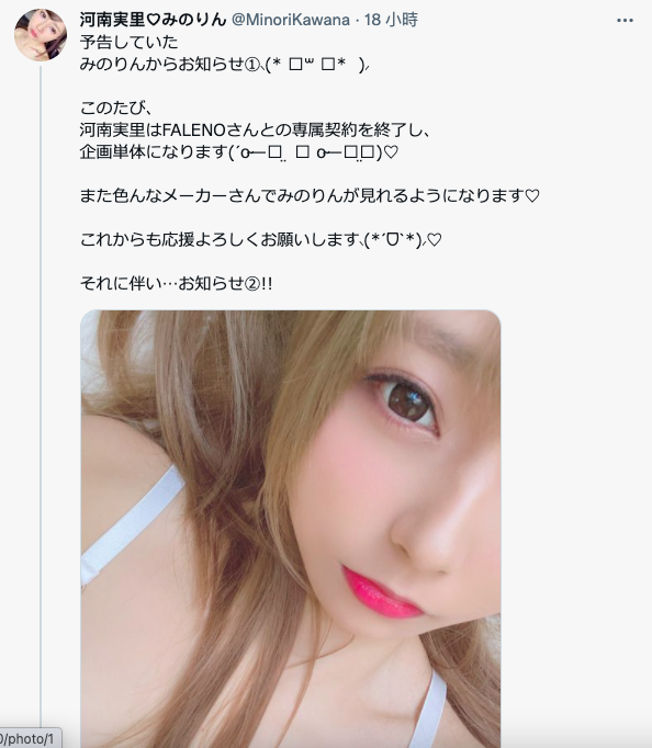 有两点,首先,河南実里证明了大家的猜测,她与Faleno的专属契约已经结束,但还好,她不打算引退,接下来要以企划女优的身分继续奋斗;再来,她决定要开设粉丝俱乐部了,时间定在12月1日,细节会在当天再公布: