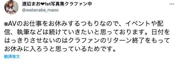 这样的讲法很玄,她不是引退,也不是休业,是暂停AV女优的活动,但到底暂停了什麼活动?她说了,见面会照办、直播也会照做、写作也不会停⋯所以,或许,大概,说不定,渡辺まお(渡边真央)只是不拍了吧?