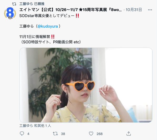 是的,最会爆雷的经纪公司8MAN和最会炒话题的片商SOD STAR又合作了,这位「工藤ゆら(工藤由罗)」就是之前去上纱仓节目那位不肯露面的SOD STAR新任专属女优,在进入11月的第一天,她终於拿下太阳眼镜,以真面目示人惹~