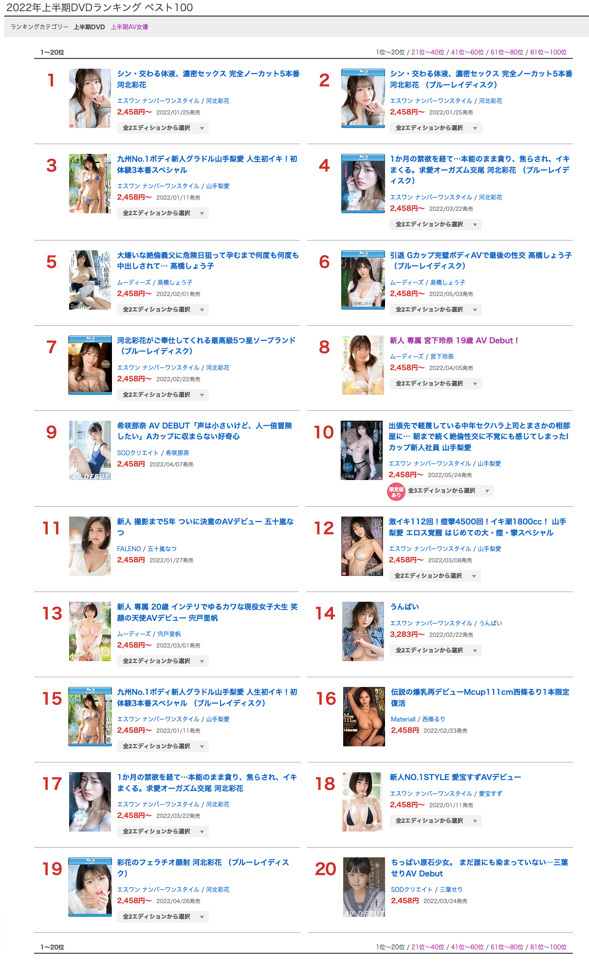 马上来看FANZA 2022年上半年实体DVD销售排行榜:第一页的前20名,我只有一句话好说,那就是—